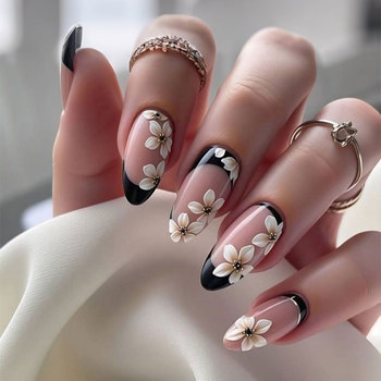 Thanh lịch hoa Báo Chí trên móng tay, 3D Hoa Trắng & Đen French Tip thiết kế, hạnh nhân giả móng tay cho hàng ngày & bên