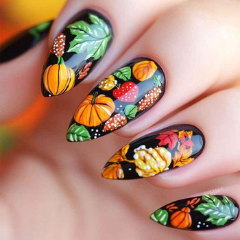 Thu Thu Hoạch Báo Chí Trên Móng Tay Với Bí Ngô Và Mùa Thu Lá Thiết Kế Hạnh Nhân Móng Tay Giả Cho Lễ Tạ Ơn