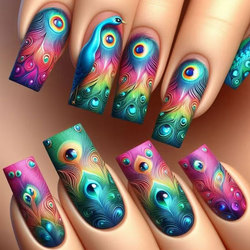 24PCS lông công Báo Chí trên móng tay dài vuông giả móng tay giả