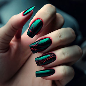 Arte de uñas verde oscuro de moda con acentos de línea roja, acabado de espejo brillante, prensa cuadrada larga en las uñas para mujeres