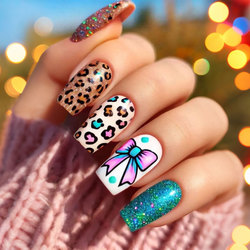 Glamorous Leopard Print & Bow Press en las uñas, Colorful Glitter Long Coffin Fake Nails, Trendy Artificail Nails para mujeres