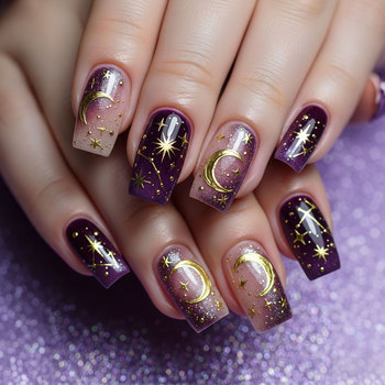 24 piezas de arte de uñas celestial elegante con acentos de luna y estrella dorados, degradado de brillo púrpura, prensa cuadrada larga en las uñas para mujeres