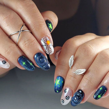 24 Uds Halloween Prensa en uñas medianas almendra uñas postizas cubierta completa azul araña web estrella uñas postizas